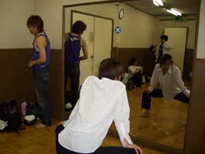 ストレッチする藤内くんと、着替え中のヤス。 実はこの後ヤスのパンチラ写真を撮ってしまったのですが (わざとじゃないんですよ〜!!)、えー、ボツです。没。 |